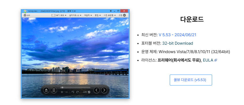 **꿀뷰(HoneyView)**는 국내 소프트웨어 개발사인 **반디소프트(Bandisoft)**에서 개발한 무료 이미지 뷰어입니다.