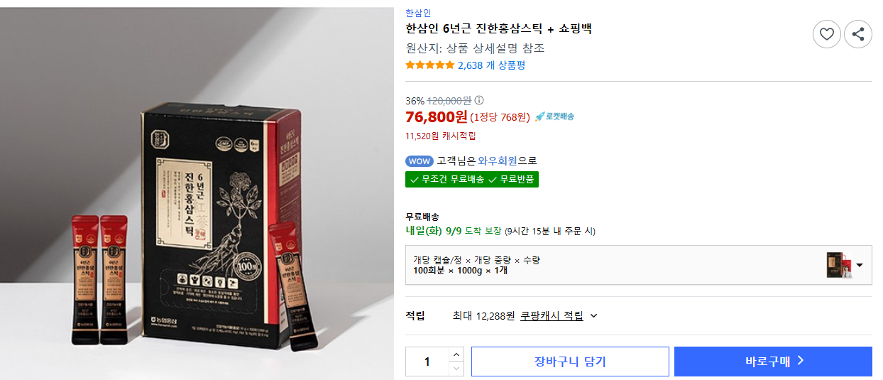 현재 별점 4.8점, 리뷰 2638개를 가진 한삼인 6년근 진한홍삼스틱 + 쇼핑백! 지금 쿠팡에서 더 저렴하고 다양한 홍삼/인삼 제품들을 확인해보세요.
