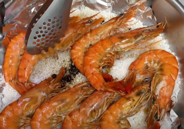 소금을 팬 위에 올린 뒤 뚜껑을 덮고 중불에서 15–20분 동안 열을 가해 소금의 수분을 날려주는 것이 포인트입니다. 이렇게 하면 소금이 열에 더 안정적으로 반응해 다음 단계에서 대하가 균일하게 익습니다. - 대하 올리고 맛술 추가
