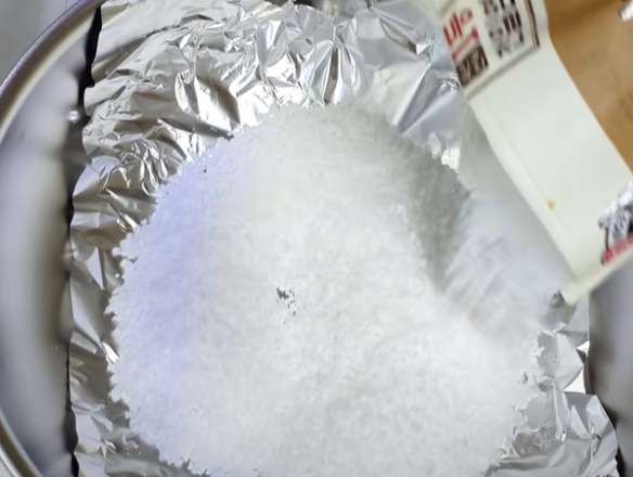 프라이팬에 종이호일이나 쿠킹호일을 깔고, 굵은 소금을 넉넉히 2컵 가량 깔아주세요. 소금이 팬에 달라붙는 것을 방지하고, 열을 고르게 분산시키는 역할을 합니다. - 초벌 가열