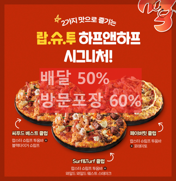 - 모든 피자(M/L), 사이드디시 → 배달 50% / 포장 60% 할인