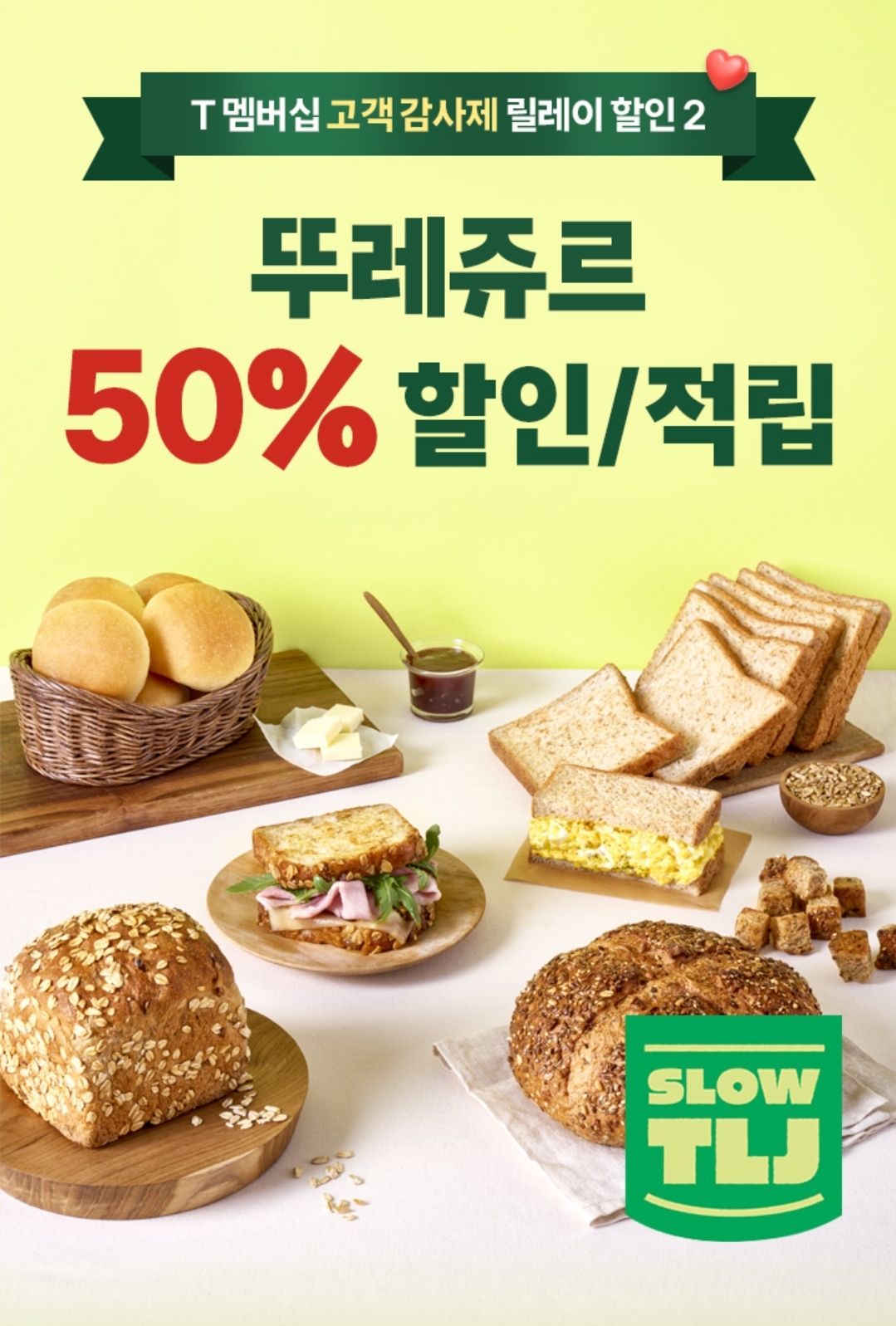 할인 혜택 : 뚜레쥬르 제품 50% 할인 또는 적립 (최대 10,000원 한도)