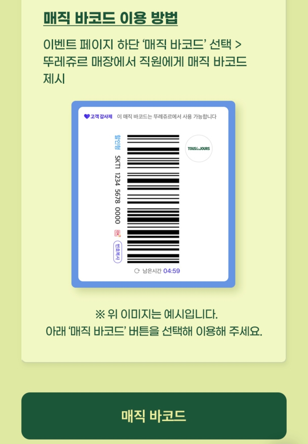 - 뚜레쥬르 직원에게 생성된 바코드를 보여주면 자동으로 50% 할인 또는 적립이 적용됩니다.