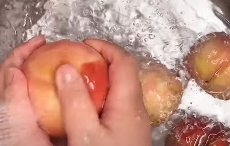 - 복숭아를 흐르는 물에 깨끗이 씻어요.