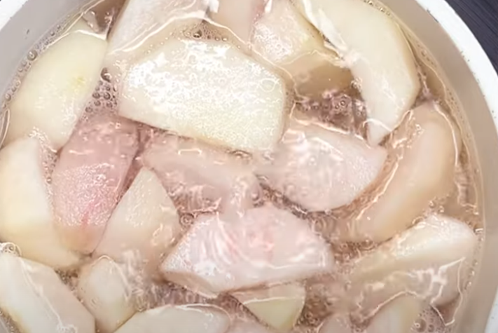 - 설탕물이 끓기 시작하면, 썰어둔 복숭아를 넣어요.