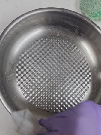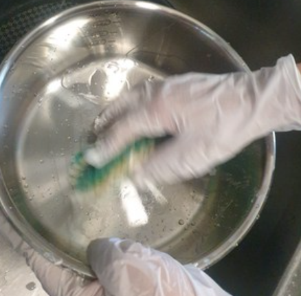 - 제품 도포 : 수세미에 세척제를 적당량 짜서 스테인레스 후라이팬 전체에 부드럽게 문지릅니다.