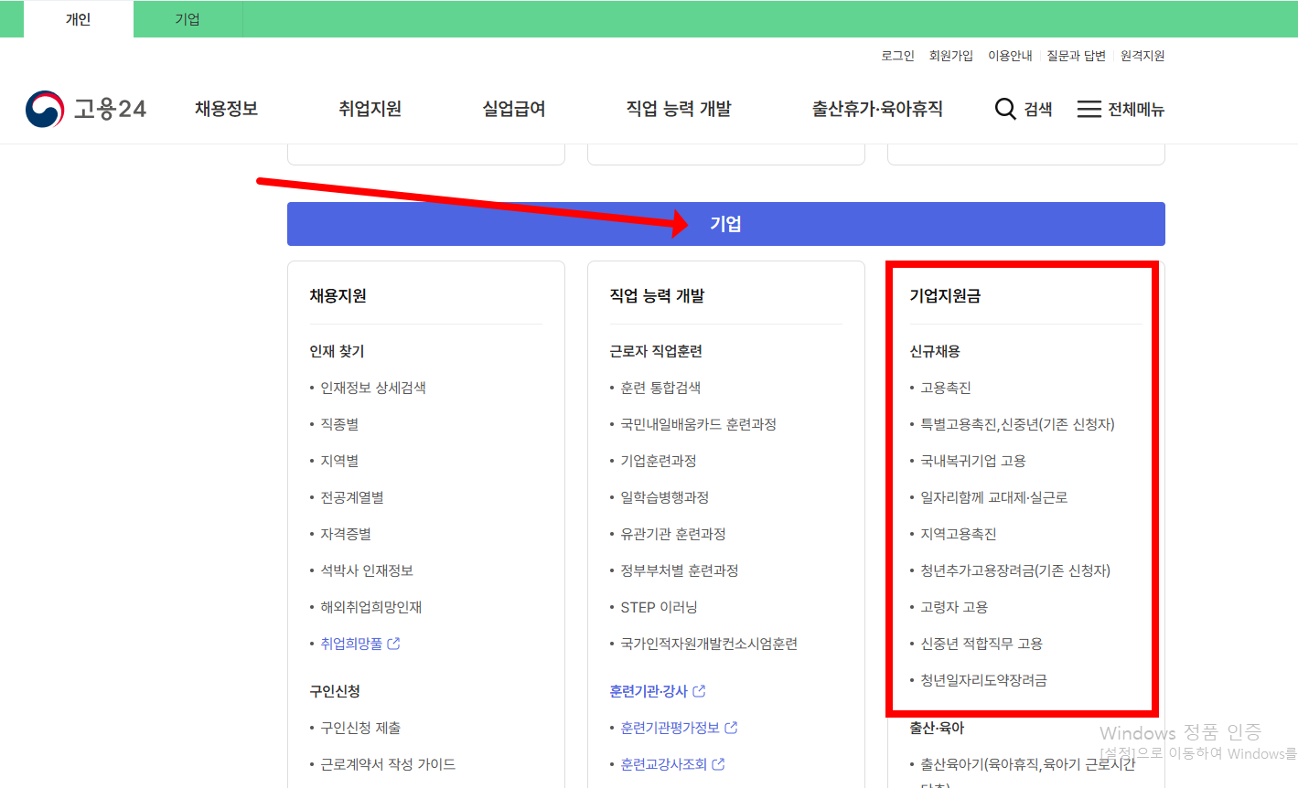 2단계. 로그인 후 ‘기업지원금’ 메뉴 클릭